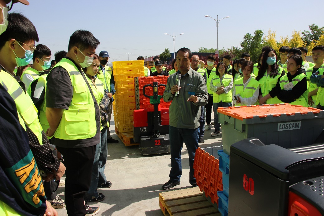 撒凤雄带领同学们参观新百物流设备载具,详细介绍了“物流模术”“折叠框”“周转箱”等概念,工作人员现场演示了前置式叉架起货机、笼式搬运筐、地牛等设备载具。撒凤雄结合自身工作经验向大家逐个介绍载具优缺点及改进措施;马东彦就“物流模术”概念做了详细讲解与演示,同时结合参观实际,就高位货架、拣选车设备作了讲解;王冠就配送车辆尾板问题引导学生进行创新设计。
